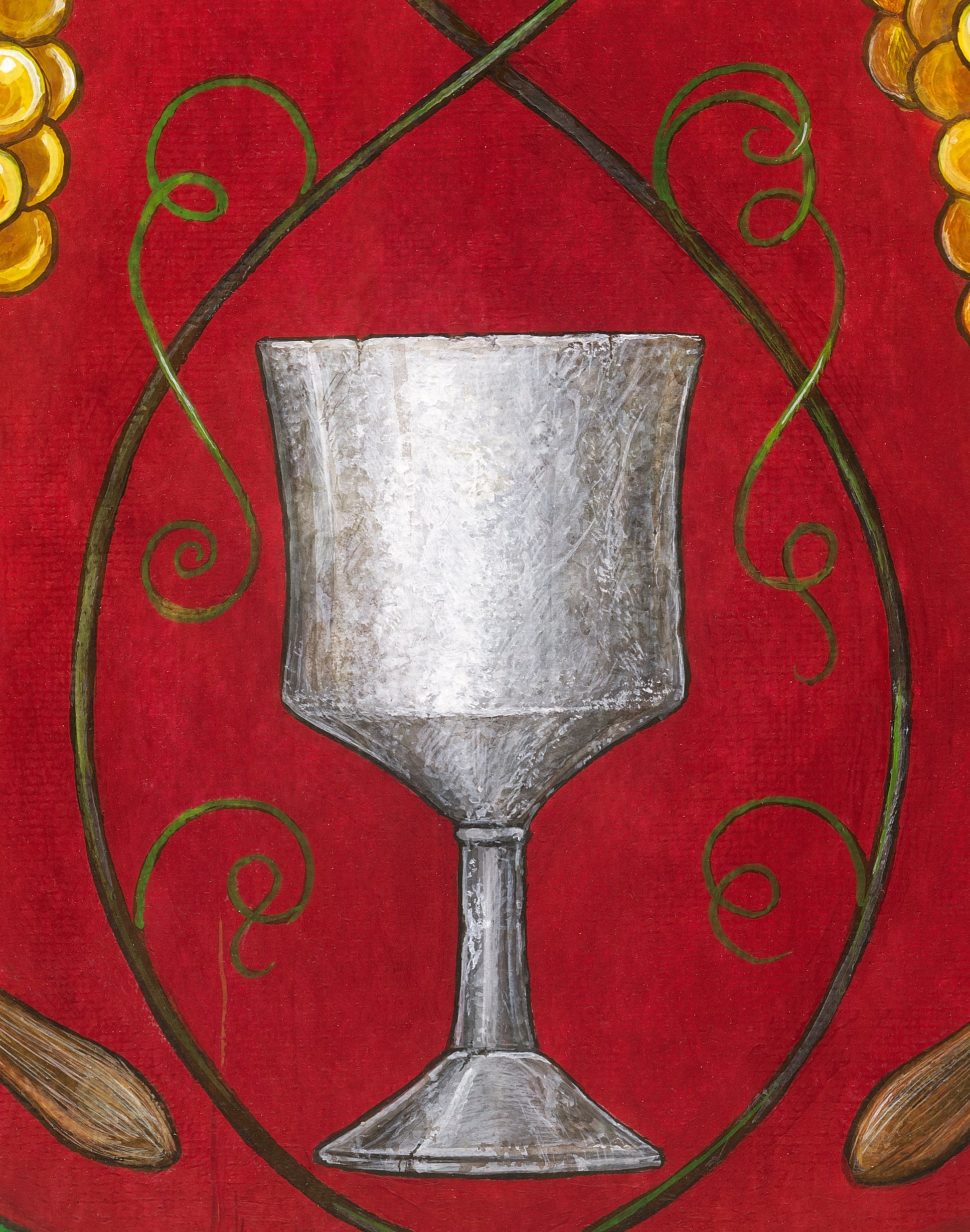-ein silberner Kelch, umrankt von goldenem Wein auf rotem Grund, flankiert von zwei Winzermessern