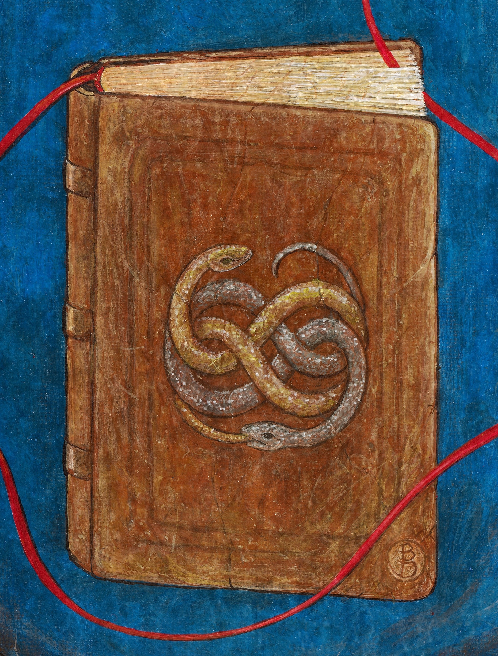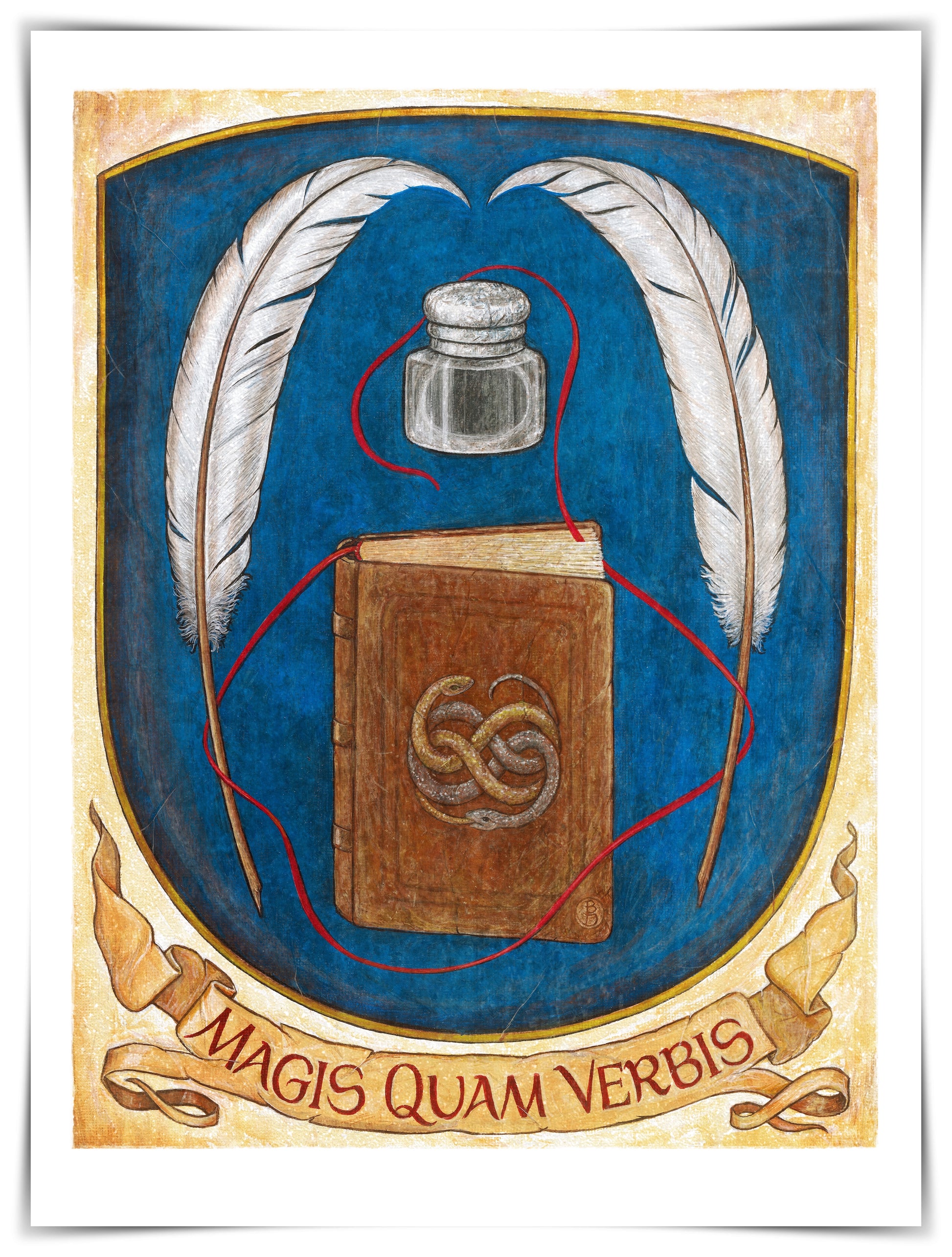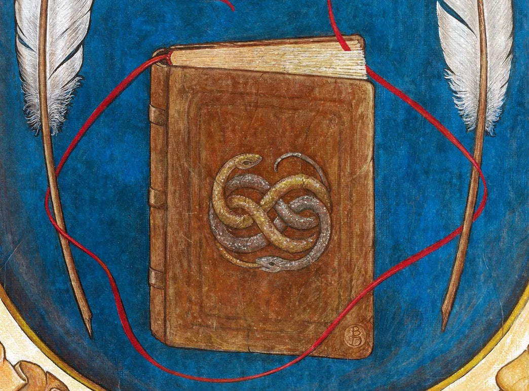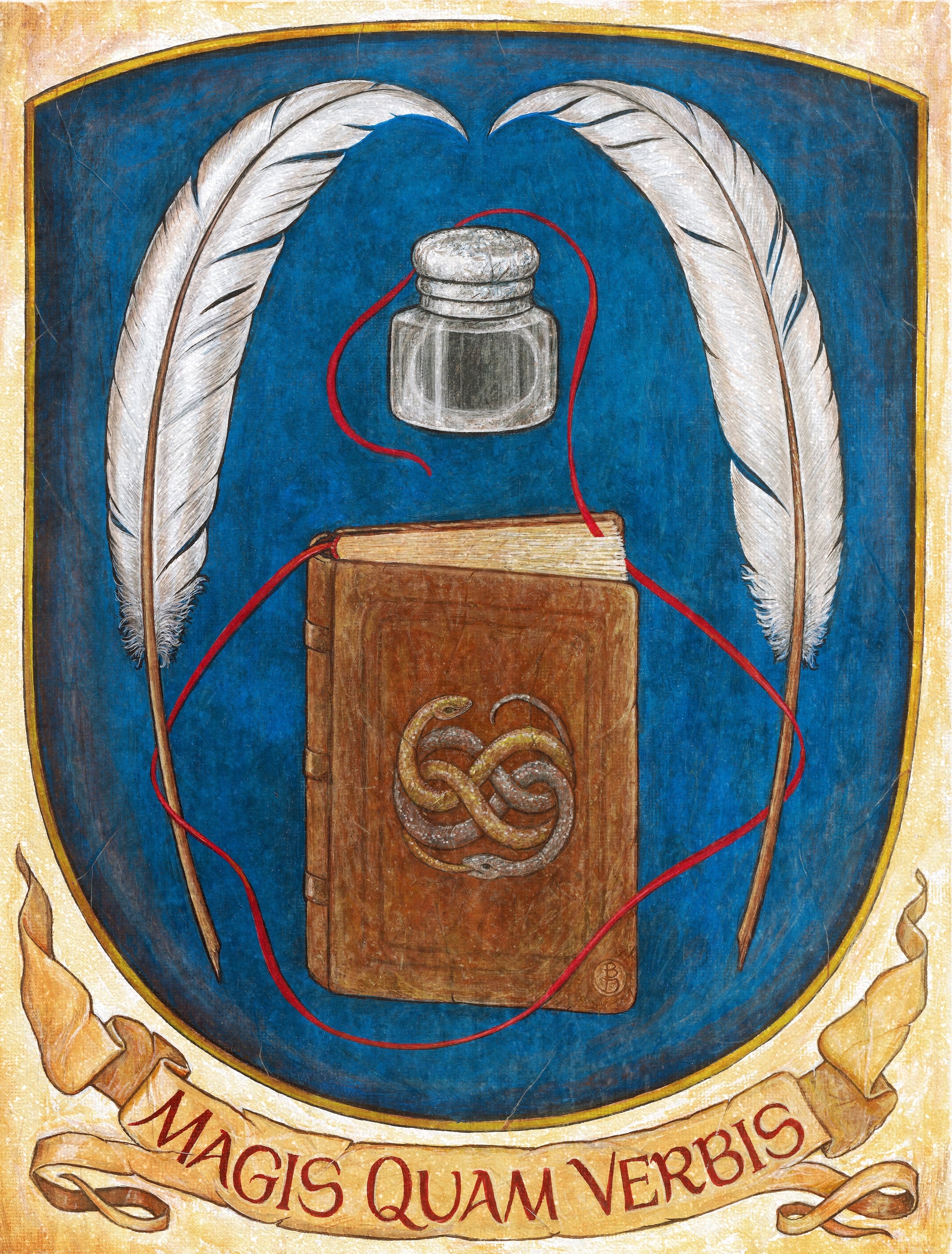 -zwei Schreibfedern flankieren ein (Notiz-)Buch, dessen Deckel zwei ineinander verschlungene Schlangen zieren (ja, hier zitiere ich frei ein bestimmtes Schmuckstück…)