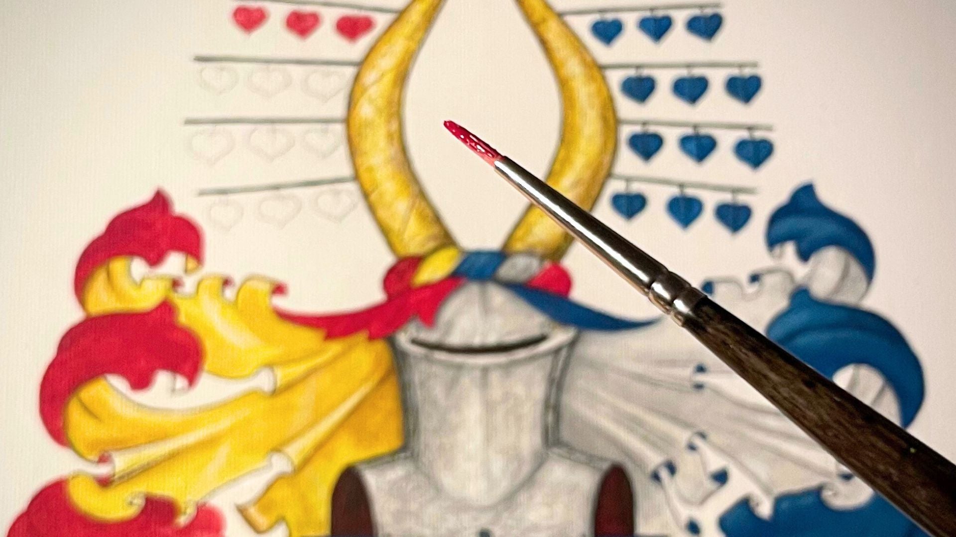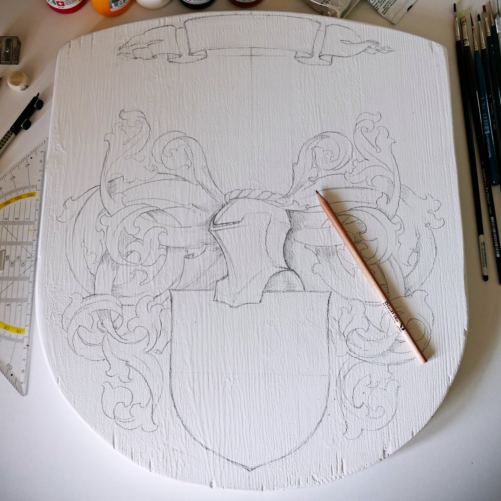 4. Schrittweise Entwicklung: Wir starten mit dem Wappenschild. Ich skizziere bis zu 3 Entwürfe mit Bleistift, und nach Ihrer Auswahl entwickle ich Helmzier, Farben, Formen und weitere Details.