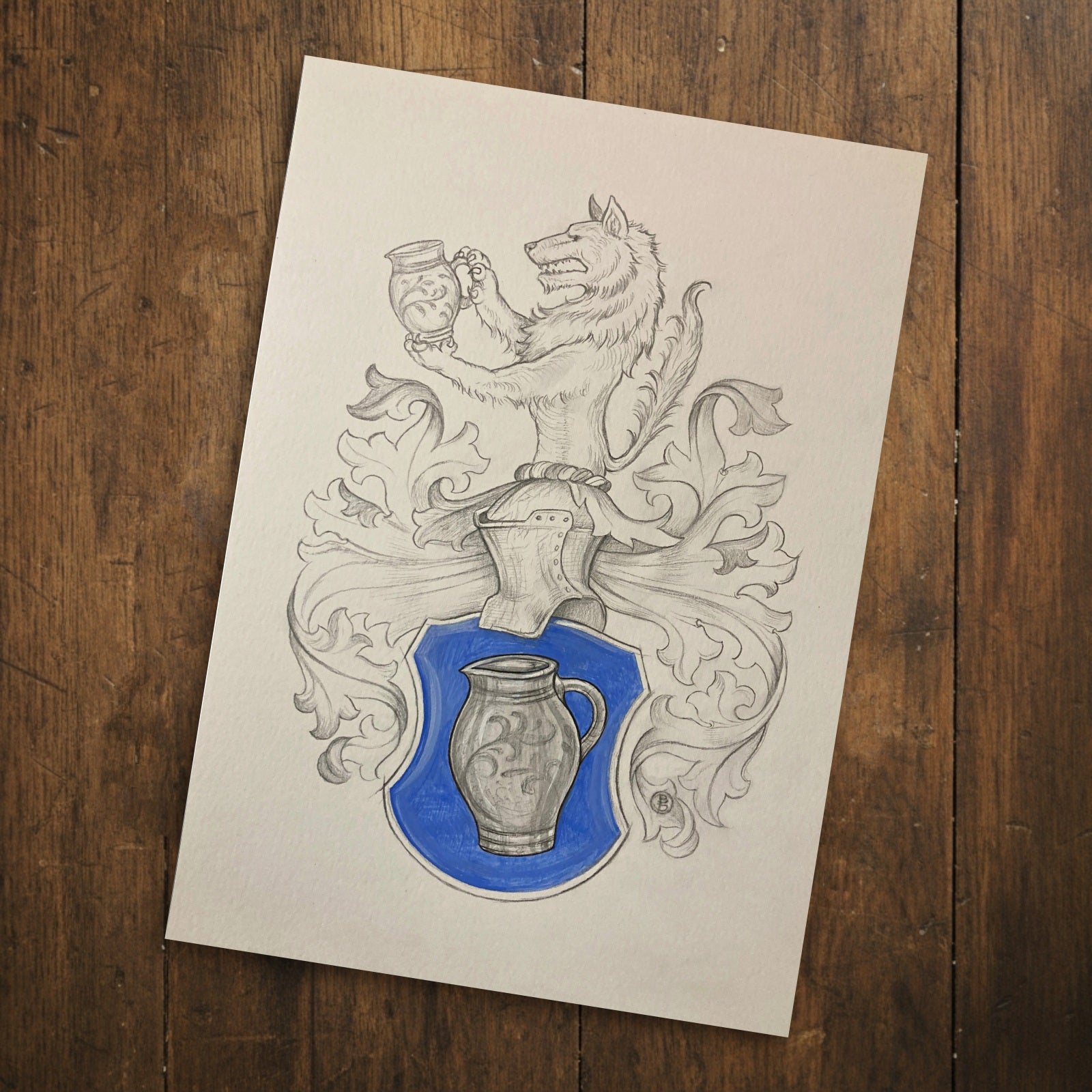 Bespoke Family Coat of Arms – Original Colourized Pencil Sketch (A4) – Handmade Heraldic Art